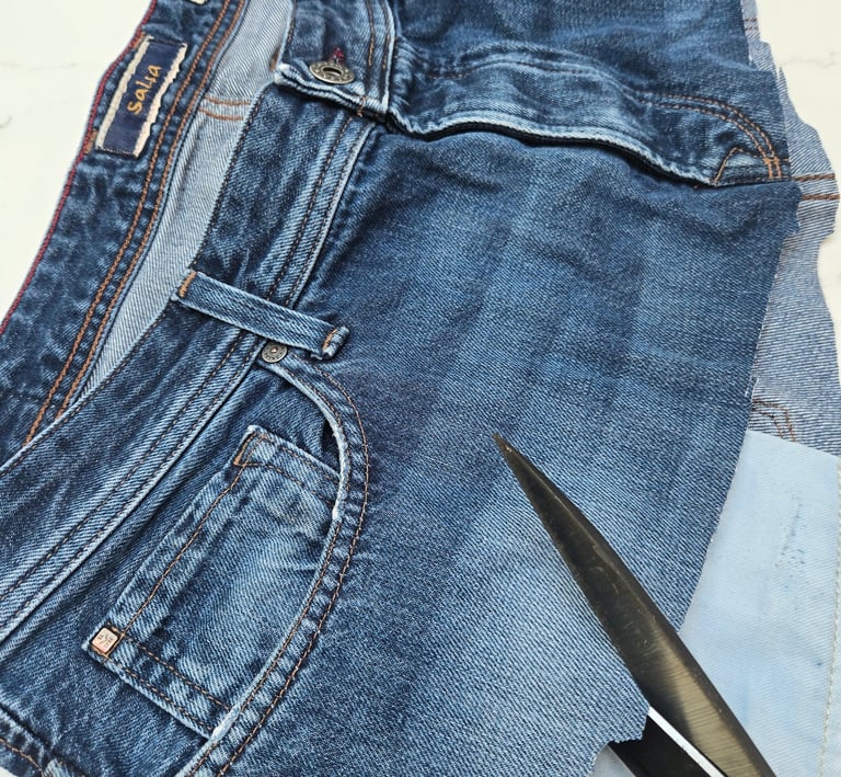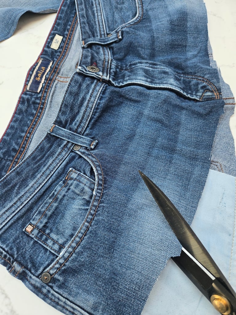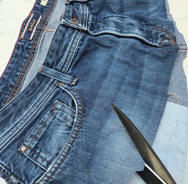 We source fabrics from landfills, charity shops, and kind donations. We buy very little. Minimal facing/padding and thread. We try to re-use everything, zips, belt loops etc and form them into our designs.